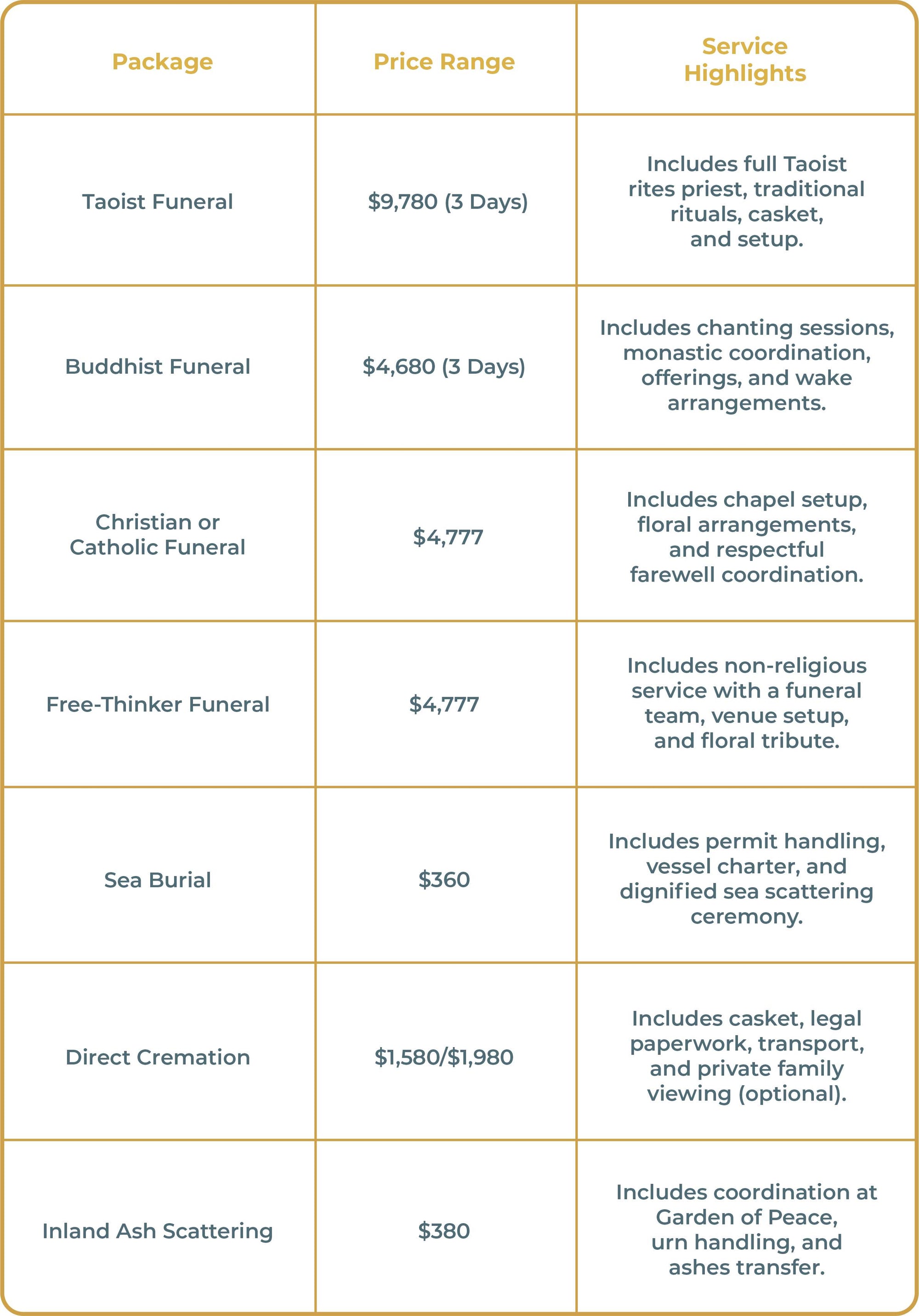 We offer complete funeral services for Buddhists, Taoists, Christians, Catholics, Free-Thinkers, and direct cremation arrangements – tailored with cultural and spiritual sensitivity. We can also conduct sea burials and provide ash scattering services.